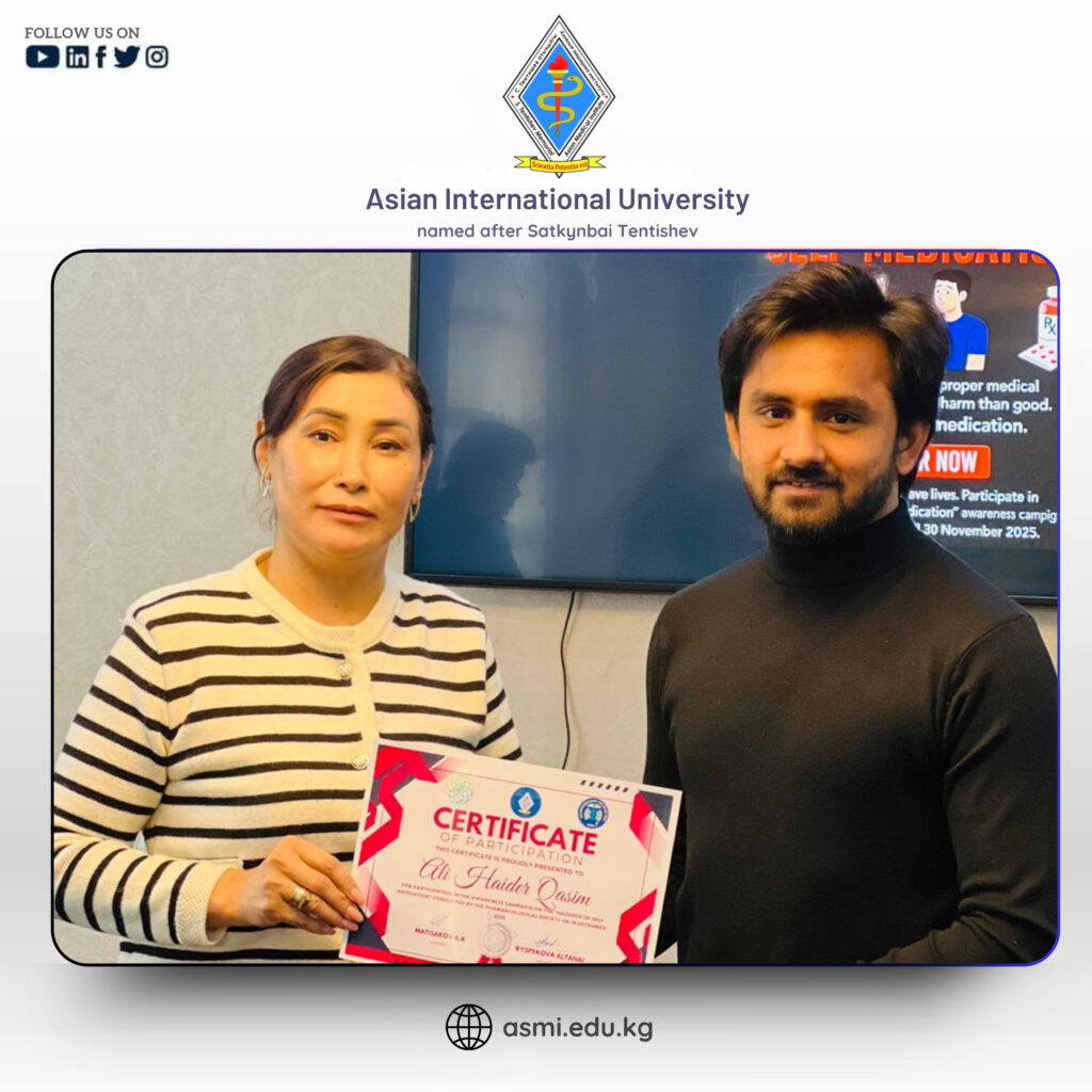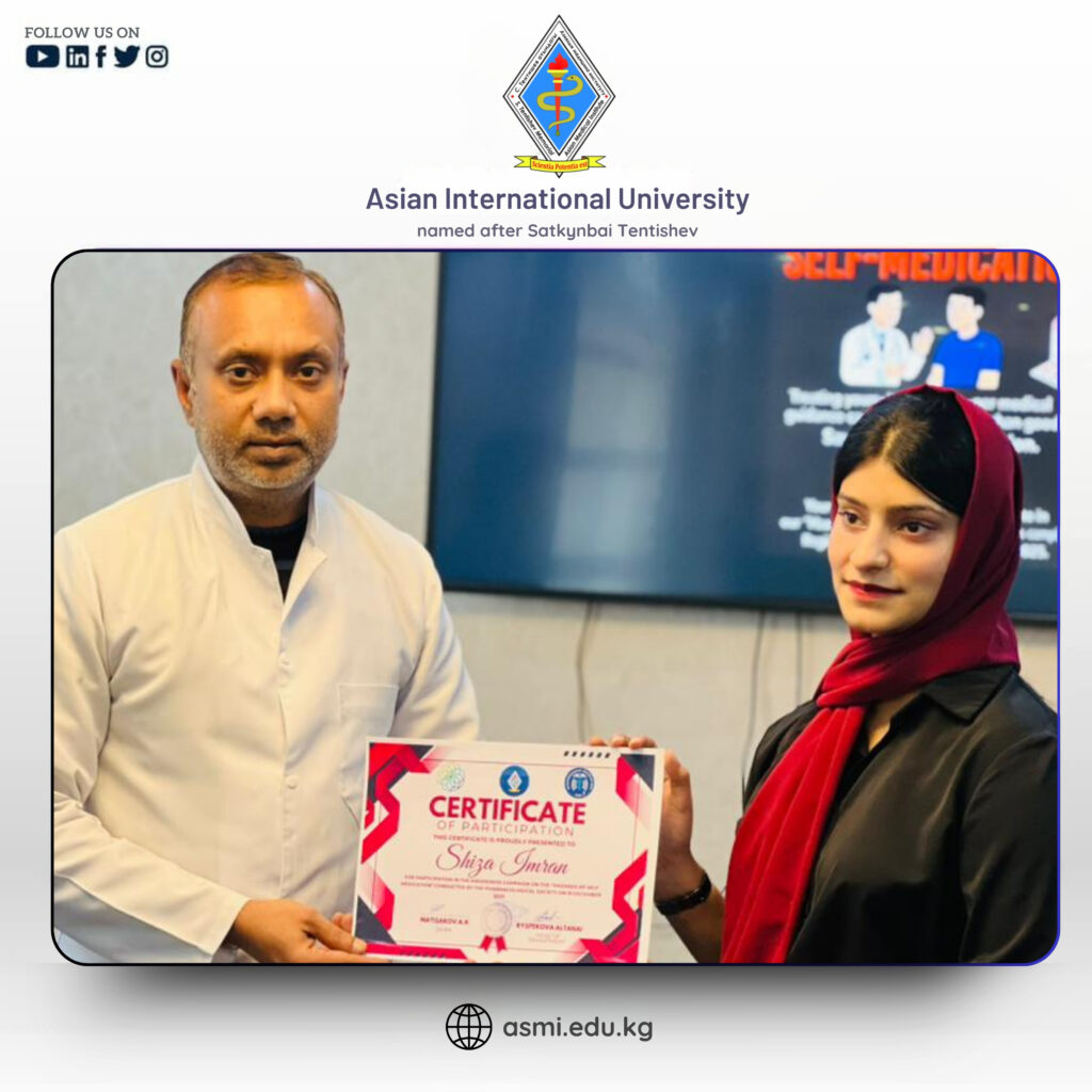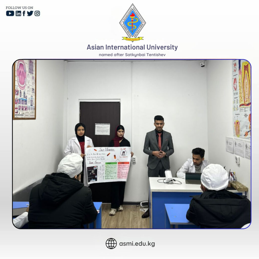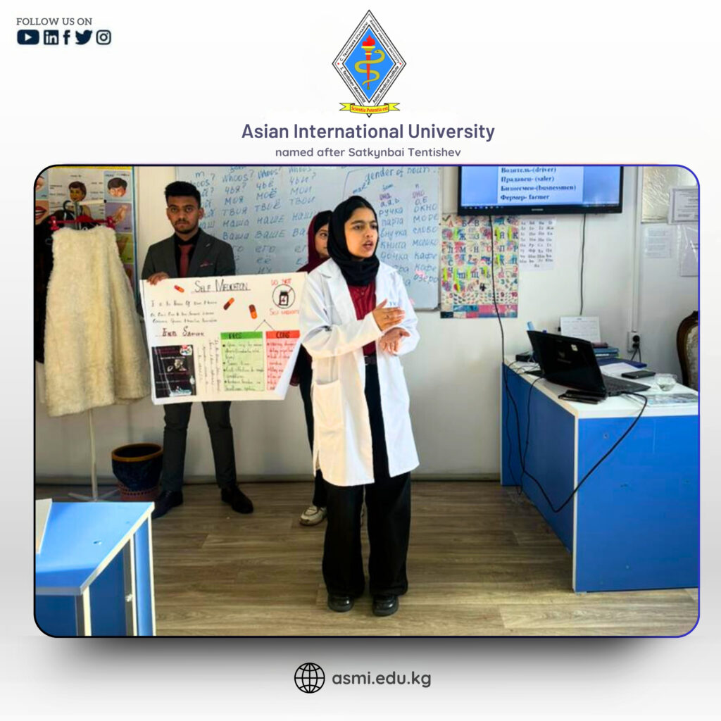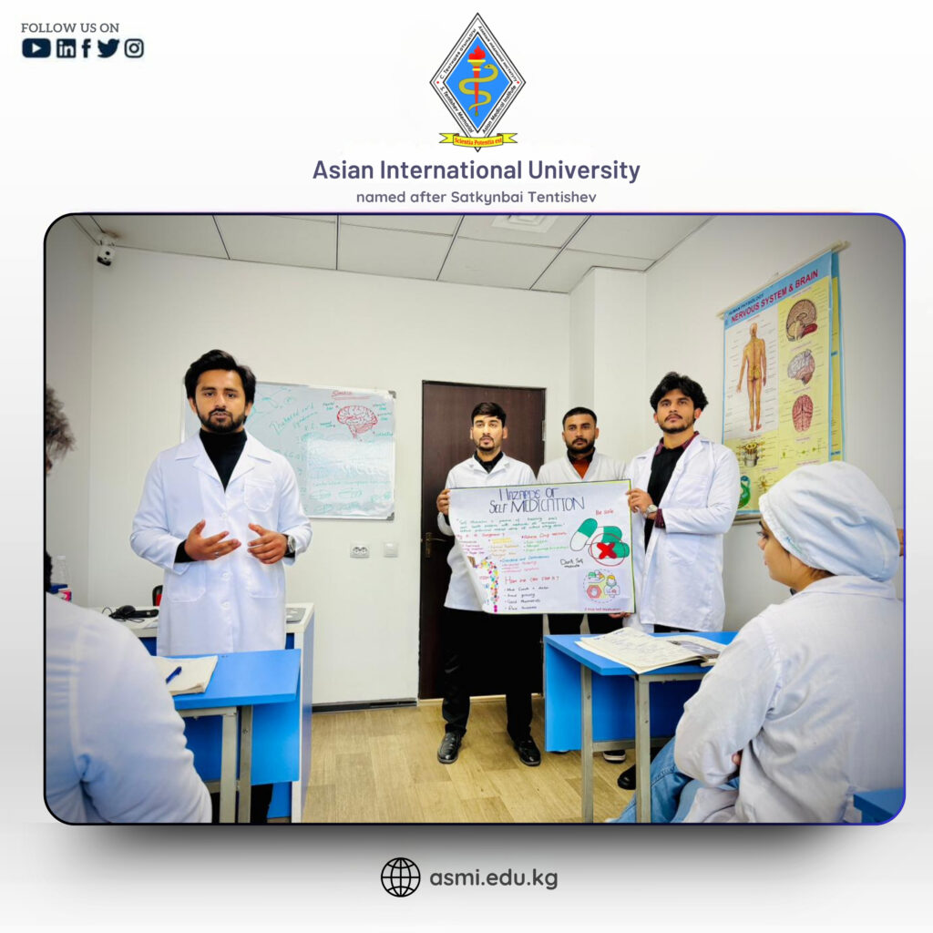 Following a brief promotional drive, participating students visited different classrooms across the institute to raise awareness about the dangers of self-medicating without proper medical consultation. The campaign particularly addressed the local context of Kyrgyzstan, where frequent cold weather often leads studentsโespecially international studentsโto self-treat symptoms such as headaches, fever, and flu, sometimes overlooking underlying medical conditions.